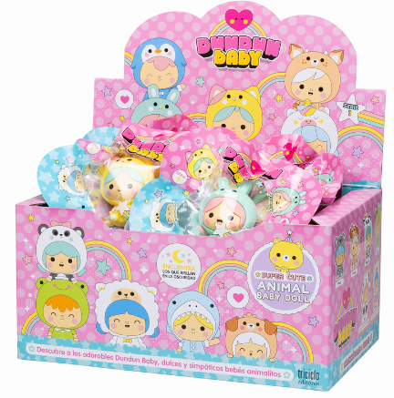 Los muñecos Dundun Baby son unos preciosos bebés vestidos de animalitos con una textura muy suave. Hay doce para coleccionar, cuatro de ellos son especiales y brillan en la oscuridad. Los amiguitos Dundun Baby miden entre 6,5 cm y 7 cm de altura sentaditos.
