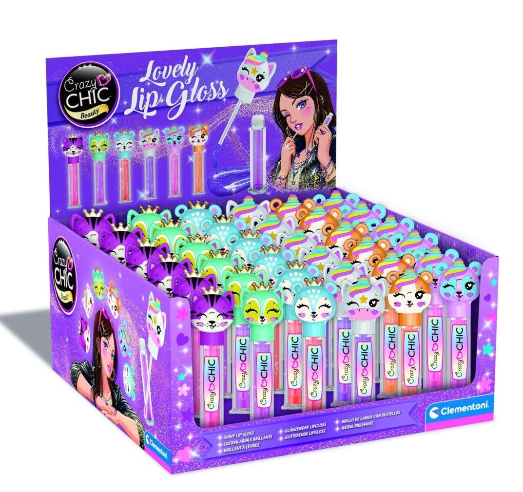 Expositor con 36 envases de brillo de labios (GLOSS) con colores surtidos y tapón de 6 modelos de animales fantásticos diferentes.