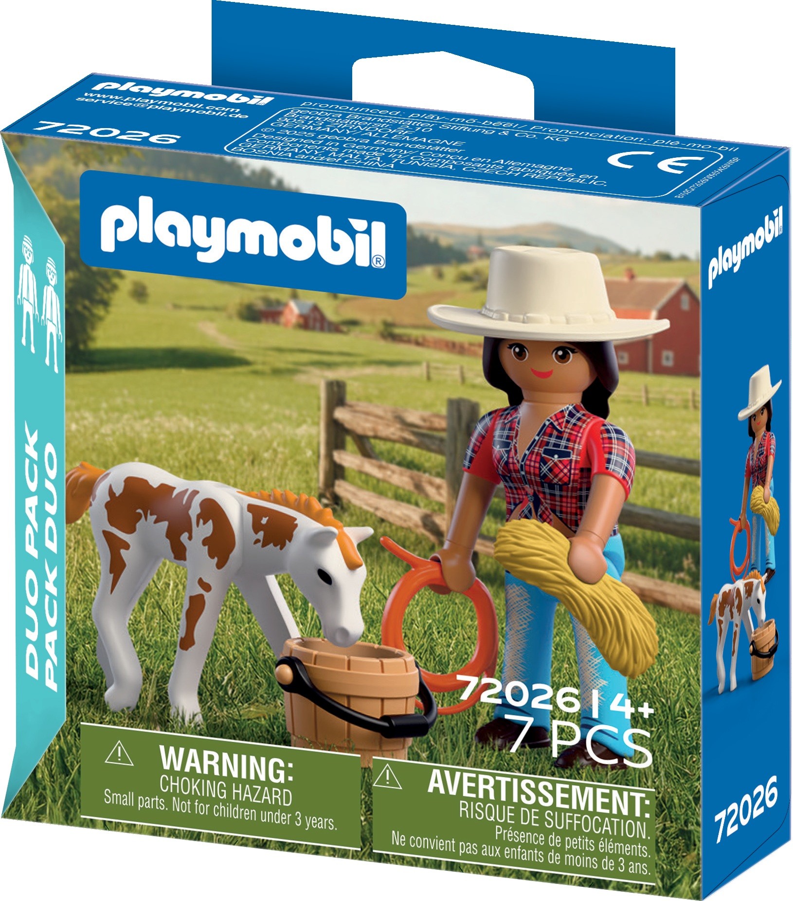 La amazona del oeste cuida con cariño a su joven potro Appaloosa. Con paja fresca, agua fresca y un lazo, el caballito está bien cuidado. Los niños pueden representar escenas, mover la cabeza e inventar sus propias historias, para vivir imaginativas aventuras sobre cuatro pezuñas.