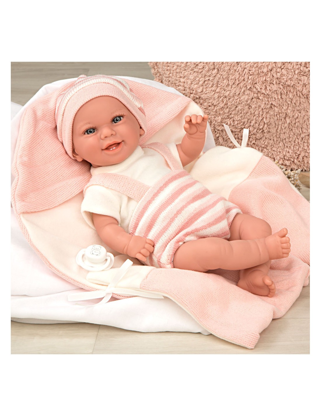La muñeca Elegance Babyto de 35 cm viene con un precioso vestido estampado en tonos rosa y blanco, acompañada de una manta a juego. Su peso realista hace que parezca un bebé de verdad, brindando una experiencia de juego única. Además, incluye un chupete y una manta para mayor realismo y cuidado. Ideal para coleccionistas y niños que buscan una muñeca con detalles realistas y encantadores. ¡Perfecta para regalar y disfrutar!