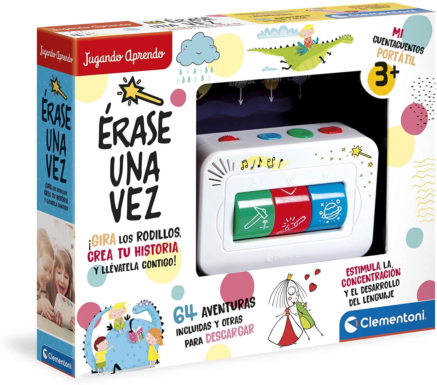El niño puede girar 3 rollos para decidir el escenario de la historia y el protagonista (entre animales, personajes ficticios o disfrazados y profesiones) para crear el cuento eligiendo su final.