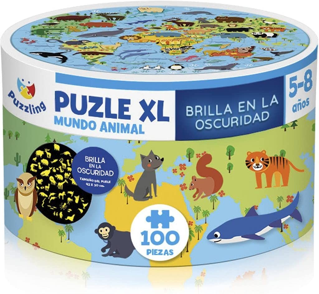 PUZLE XL: MUNDO ANIMAL 5-8 años / 100 piezas Contenido: Puzle brilla en la oscuridad Tamaño: 14 x 14 x 11 cm. ¡Con piezas troqueladas que brillan en la oscuridad!