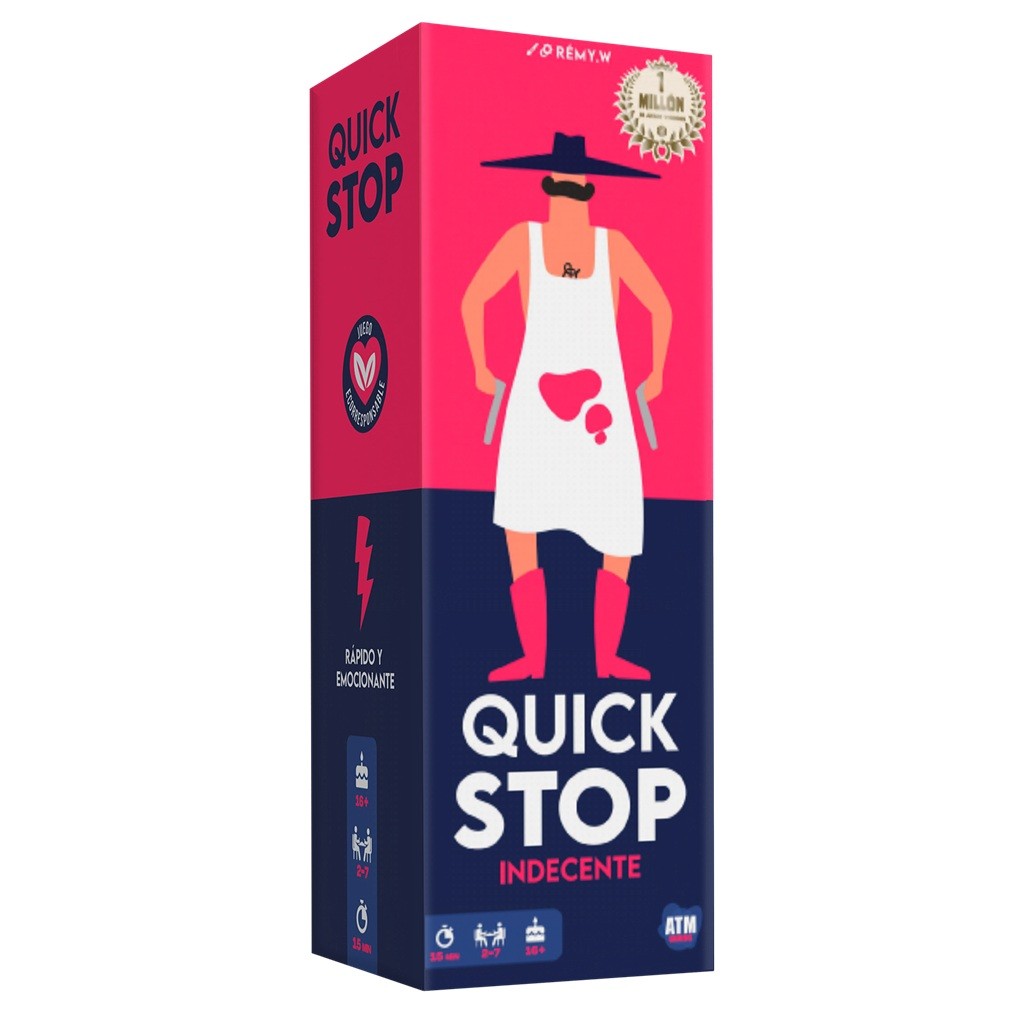 Quick Stop Indecente es un juego de cartas rápido, divertido e impredecible para mayores de 16 años. Los jugadores deben deshacerse de sus letras respondiendo palabras relacionadas con categorÃas más rebeldes que en el clásico Quick Stop. Al principio de cada ronda los jugadores reparten un número de cartas de letra a cada jugador según su edad. Una vez empieza la ronda, se gira la carta central, la cual desvela una temática. Cada jugador tiene que responder con rapidez una palabra relacionada con el tema. El primero en quedarse sin cartas gana la ronda. El primero en ganar 3 rondas, gana la partida.