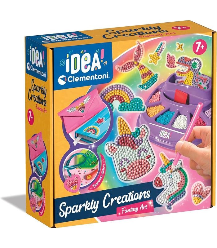 ¡Un nuevo juego basado en la actividad de los diamantes para crear creaciones brillantes y coloridas! Gracias a la guÃa de color y al bolÃgrafo correspondiente, se pueden aplicar fácilmente las gemas 3D en stickers de diseño original y divertido. Gracias al práctico soporte para accesorios, puedes mantener todos los componentes ordenados. En esta versión las ilustraciones son temáticas de fantasÃa, con unicornios simpáticos… ¡también colecciona las otras versiones de la lÃnea Sparkly Creations de Idea!¡Una actividad moderna y creativa para mejorar la concentración y experimentar su propia manualidad, para entrenar manos y cabeza!
